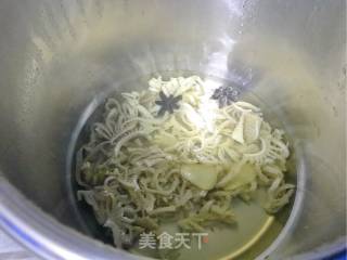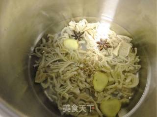 步骤2、高压锅里水漫过牛百叶,放入八角,小茴香,料酒,姜片。