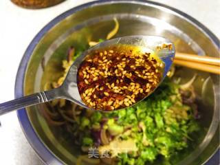 步骤11、加入香菜和一汤匙事先炸好的辣椒油(盐+五香粉+四川麻椒)。