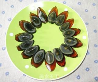 步骤1、皮蛋剥好,切成4瓣,摆入盘中。