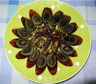 步骤6、将炒好的辣椒盛入装有皮蛋的盘中。在辣椒和皮蛋处淋上醋,吃时拌匀即可。