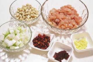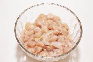 3、 腌制鸡肉的时候,不用放太多的淀粉,鸡肉表面薄薄裹一层就行,太多会影响鸡丁的形状。