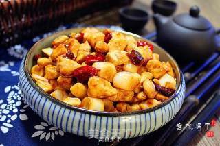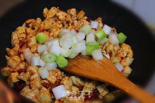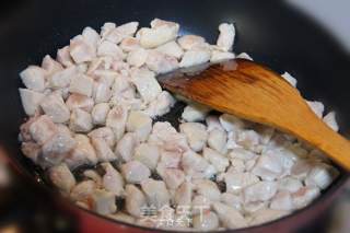 6、 自己在家里做,非常建议用不粘锅来炒这道菜。这样,可以让鸡丁的形状保持完整。