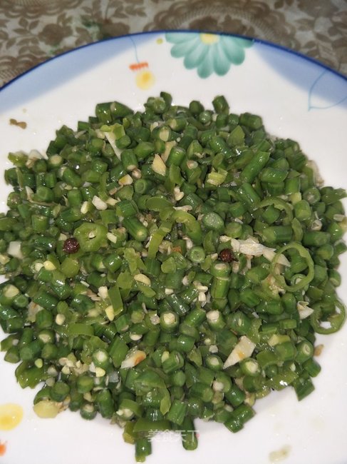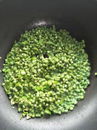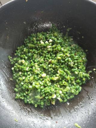 步骤5、油烧热,放入豇豆翻炒至熟。