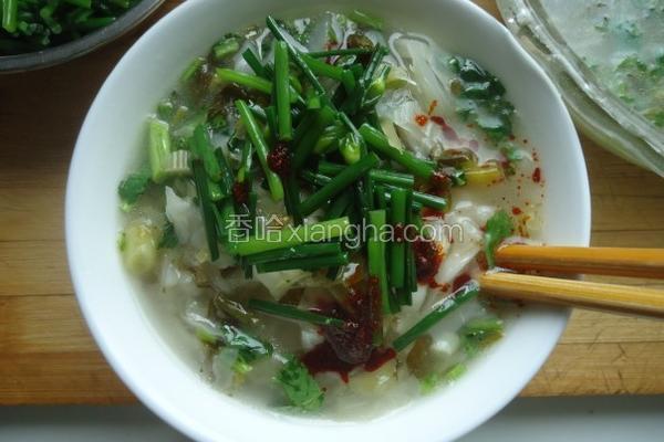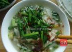步骤4、将煮好的面条舀上浆水放一些韭苔再加入辣椒油色香味俱全