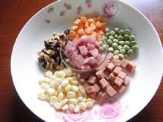 步骤1、瘦肉切丁,并用少许料酒和蚝油腌制片刻,胡萝卜切丁、火腿肠切丁、干香菇提前泡发好切丁,另准备玉米粒,青豆。