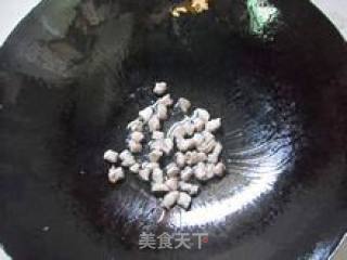 步骤4、锅中热油,下入腌制好的瘦肉丁滑炒至变色。