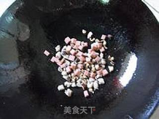 步骤5、接着下入香菇丁和火腿丁翻炒。