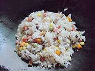 步骤7、接着下入米饭,并调入少许盐巴,翻炒至米粒松散熟透,再调入少许鸡精翻炒均匀,盛起备用。
