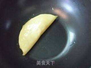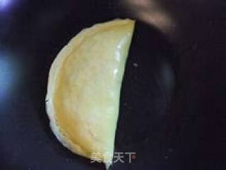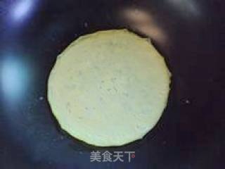 步骤9、平底锅预热后刷一层薄油,关火,倒入蛋液,转动锅子成一圆饼状,再开中火煎至底部定型。(这里要留一点点的蛋液,别倒完了,后面有用)