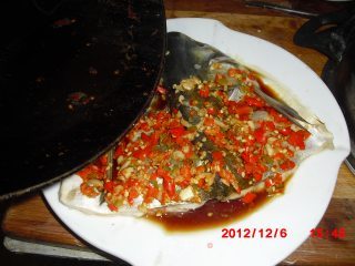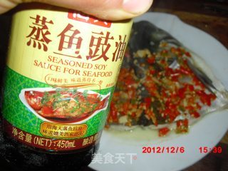 步骤5、蒸好后的鱼头均匀地淋上蒸鱼豉油