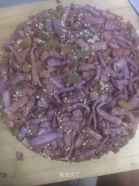 步骤7、撒上芝麻,放入葡萄干,然后倒入磨具放凉,压紧,就可以切成自己喜欢的样子了,