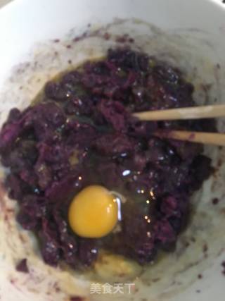 步骤2、紫薯压成泥放至温热后加入鸡蛋面粉搅拌成不沾手的面团,稍微硬一点