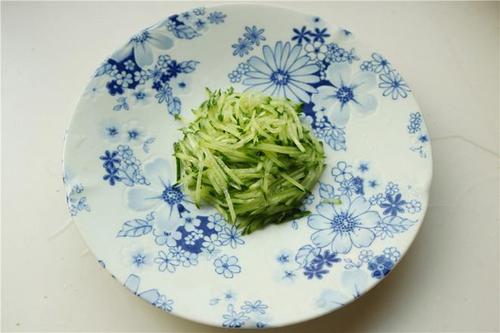 步骤9、黄瓜切成细丝,放在盘子中央。