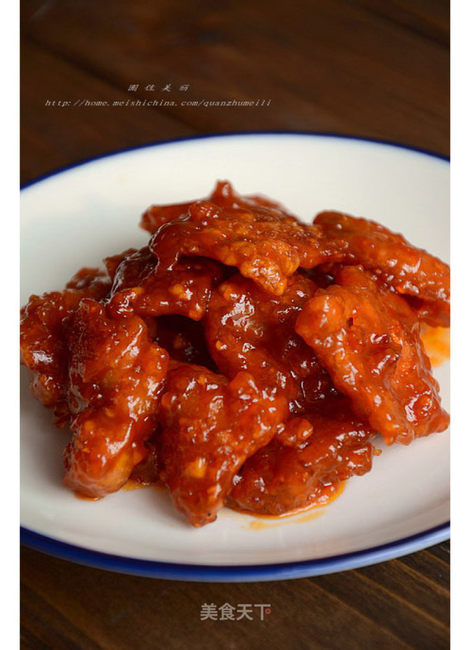 步骤10、大火快炒,肉片均匀裹上番茄汁即可。