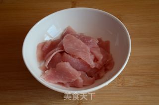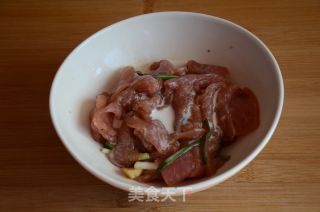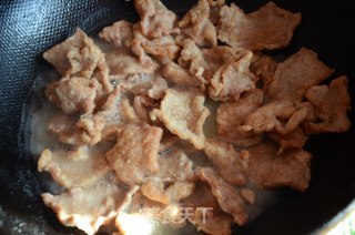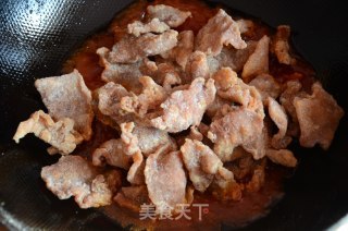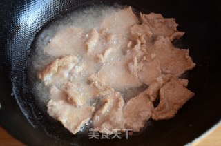 步骤4、炒锅内倒油,宽一些,六成热时一片片放入肉片。