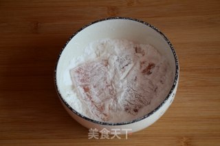 步骤3、腌制好的肉片挑出葱姜,加1勺油拌匀,一片片均匀裹上土豆淀粉。