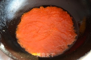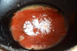 步骤7、锅中油倒出,留一点点就行,放入番茄沙司和白糖小火炒匀。