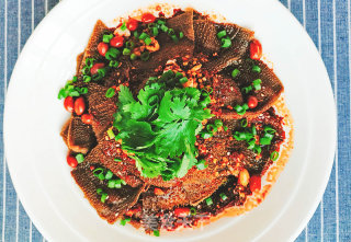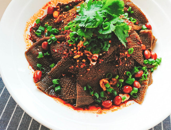 步骤6、调好的汁水淋在摆好的毛肚上,均匀的撒上油酥花生、葱花、香菜摆中间。然后,就可以拍照啦~哈哈