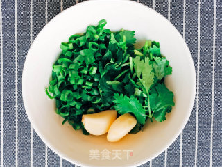 步骤3、小葱切葱花,香菜取嫩叶,蒜拍烂。凉菜一般都要放点蒜,可以消毒杀菌避免拉肚子。