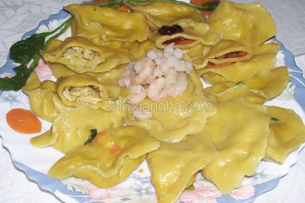 步骤5、再包两个樱桃果酱的饺子。以前过年的时候、人们就包几个里面有糖的。意义就是生活更甜美。 饺子包好以后、用汤煮熟;汤里面放剩下的虾仁、还有植物油、盐。