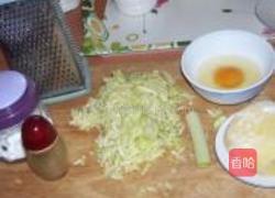 步骤1、从冰箱里面取出一个西葫芦、洗干净去皮、搽成丝、切碎末、备用。