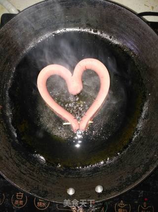 步骤3、一个做成心字形,尾端用竹签连接,放于平底锅中。