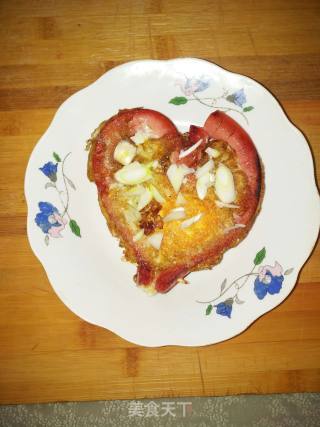 步骤4、磕入一个鸡蛋煎成如图形状 ,撒入碎盐撒上葱花,待用。
