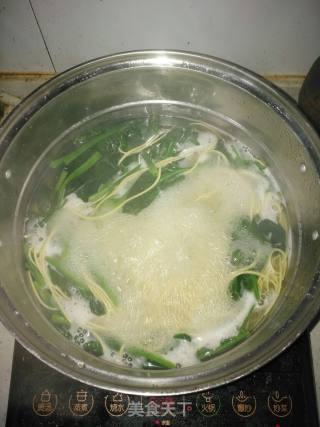 步骤6、取蒸锅一口注入清水,坐电磁炉上烧开水之后下入碱水挂面,一大把菠菜洗净后用刀去根,放入锅内于与面条同煮。