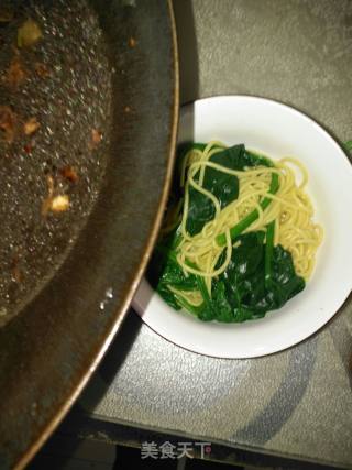 步骤8、用一个大碗捞起面条和菠菜,倒入炝锅的汤汁。