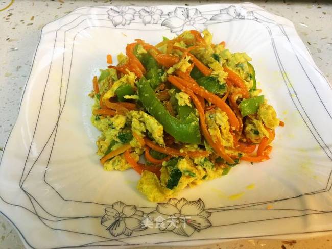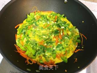 步骤7、将青椒和胡萝卜摊匀,加入鹅蛋液,转中小火烙至蛋液稍微凝固,翻炒至蛋液熟透。