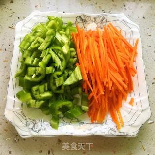 步骤3、青椒洗净去籽,切成丁备用;红萝卜去皮切成细丝。