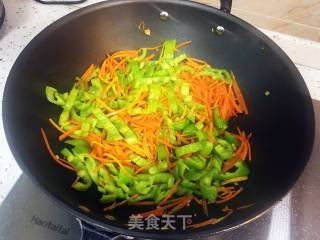 步骤6、平底锅加入适量油,油七成热下姜蒜爆香,姜蒜微微发黄加入青椒和胡萝卜,中大火煸炒至发软,加入五香粉和盐糖调味。