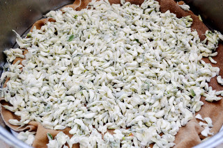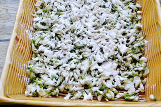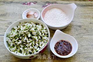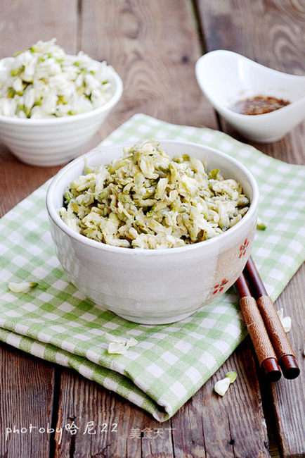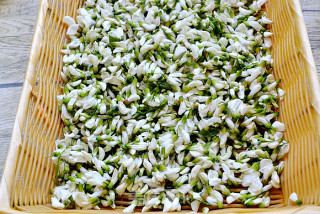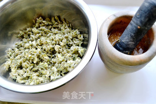 步骤6、趁热把槐花散开,蒜加辣椒油,加盐放入蒜臼捣成泥,加入水,香油,鸡精混合均匀浇在槐花里拌匀。
