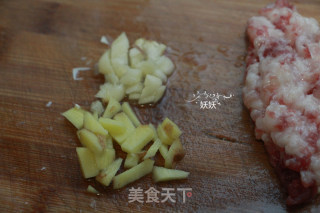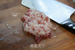 步骤3、猪肉选五花肉,肥肉多一些更香,一小块就可以,加一点盐剁成肉沫。
