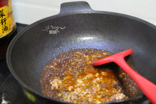 步骤6、然后倒入肉沫炒香,加入料酒,老抽,少许水煮开。