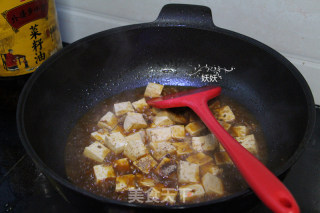 步骤8、撒适量的盐,味精,花椒粉,滴几滴红油,煮至豆腐上色。