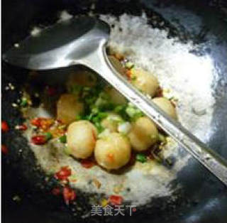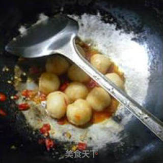 步骤5、接着,下入爆汁小鱼丸,加点盐、味精调味翻炒翻炒。