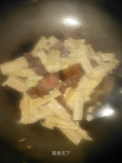 步骤7、下入腐竹煸炒。