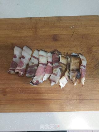 步骤3、腊肉切块再切片。