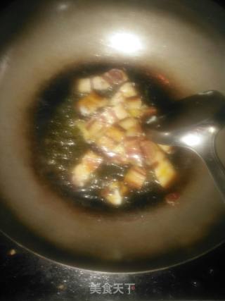 步骤6、下入腊肉炒出油脂。